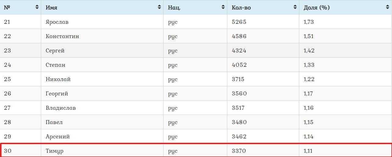 Согласно порталу открытых данных правительства Москвы data.mos.ru в период 2015-2019 год именем Тимур назвали 3370 мальчиков (30-е место).